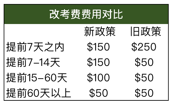 自2019年9月26日上午12点起,reschedule考试预约和cancel考试预约费用将根据提前日期将费用划分为三个阶梯: